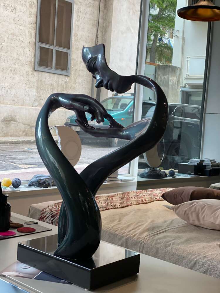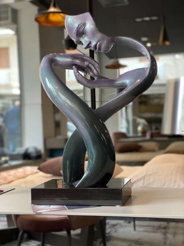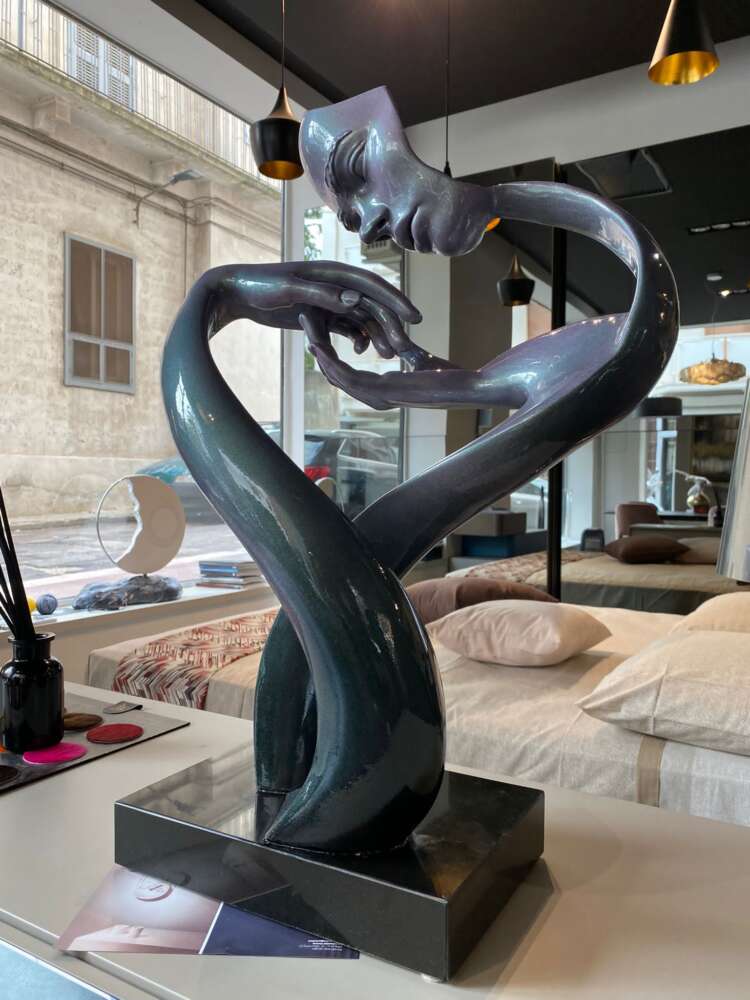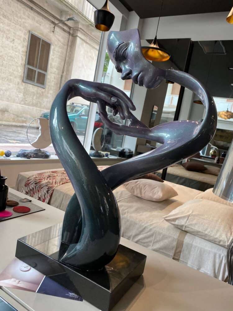 “Lightness” è una scultura figurativa moderna, realizzata dall’artista in resina satinata effetto metallo e metà delle sue braccia sfumate di bianco, con una piccola base in marmo nera e una sfera bianca. Parliamo di un opera di particolare bellezza che vede la figura di una donna poggiata come una farfalla su di una sfera. Non c’è sforzo nel volto, la leggerezza rende facile questa operazione. Questa scultura (unico pezzo in assoluto) si adatterà a qualsiasi tipo di arredamento abbiate in casa, soprattutto se in compagnia di un’oggettistica fine e delicata, i due principali attributi con i quali ci sentiremmo di descrivere quest’opera.